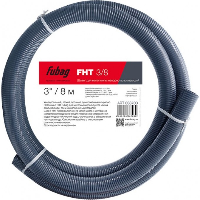 Универсальный, легкий, прочный, армированный спиралью ПВХ шланг FHT Fubag для мотопомп используется как на всасывающей, так и на напорной магистралях. Шланг FHT Fubag выполнен из устойчивого к истиранию материала и предназначен для перекачивания различных видов жидкостей: чистой воды, сточных вод с абразивными частицами и др. Совместим в работе с мотопомпами различного назначения. Имеет длительный срок эксплуатации.Товар не подлежит обязательной сертификации.